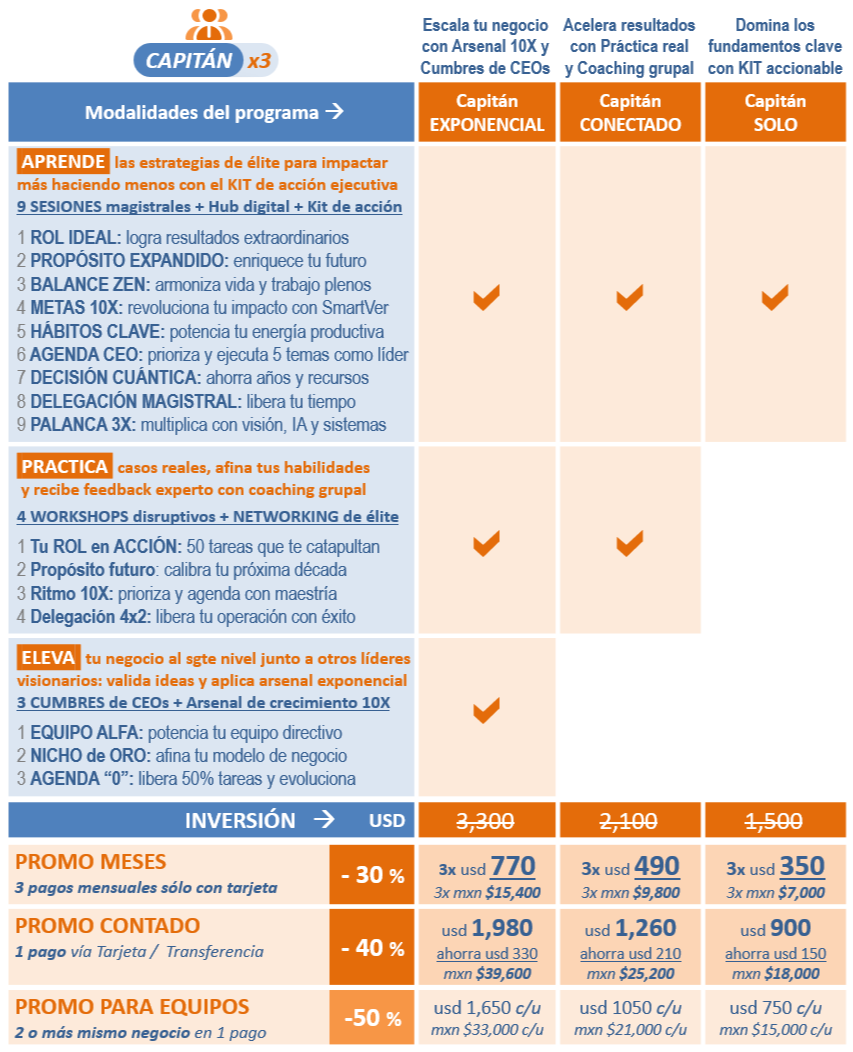 Los resultados y beneficios específicos del programa dependen de tu nivel de participación, el enfoque que pongas en participar en las sesiones y las tareas que completes y apliques en tu negocio o trabajo.