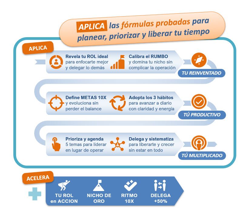 Aplica las fórmulas probadas para CALIBRAR el rumbo, PLANEAR y PRIORIZAR las metas que importan y LIBERAR tu tiempo al DELEGAR y sistematizar la operación